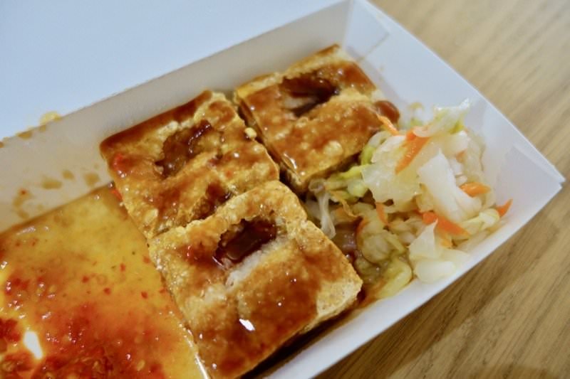 ▼ 現炸臭豆腐 $60,裡頭一共有五塊臭豆腐加上味道剛好的台式泡菜