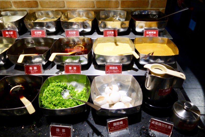 ▼沾醬與副餐的面也非常多種類,基本的沙茶醬、醬油、蔥花、烏醋白醋、蒜泥一定有,還有辣腐乳、洋蔥丁、白芝麻、花生粉、洋蔥丁跟朝天椒與花辣椒油,沾醬要多辣有奪辣!