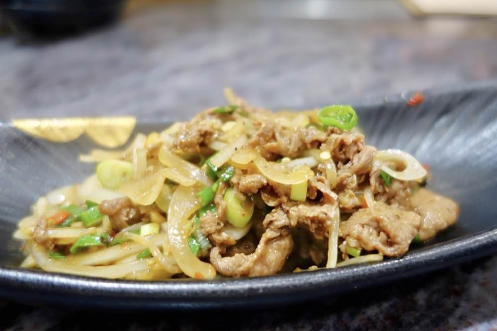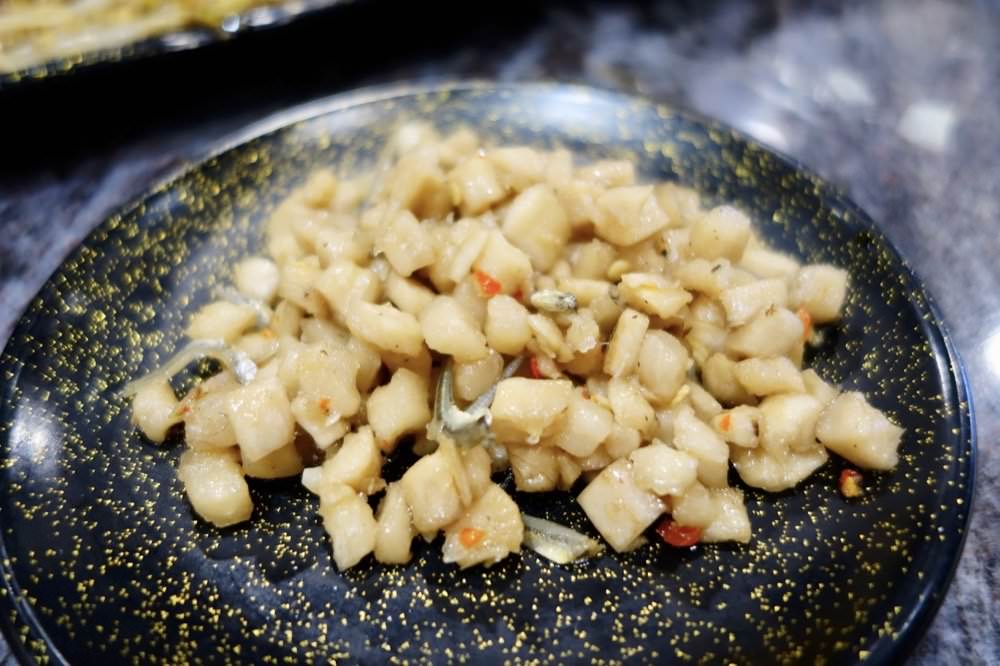 盤內有調味過的蒜末,底下再鋪一層生洋蔥,