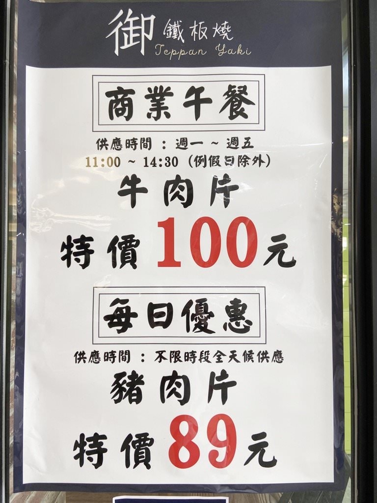 ▼ 御鐵板燒的商業午餐平日11:00~14:30牛肉片只要$100元,每天都優惠豬肉片$89元,非常平價!