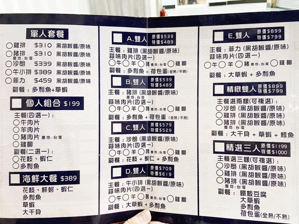 ▼ 一般全餐的價格豬肉片$130起跳,也有多利魚、鱈魚、雞排、豬排、牛排的選項