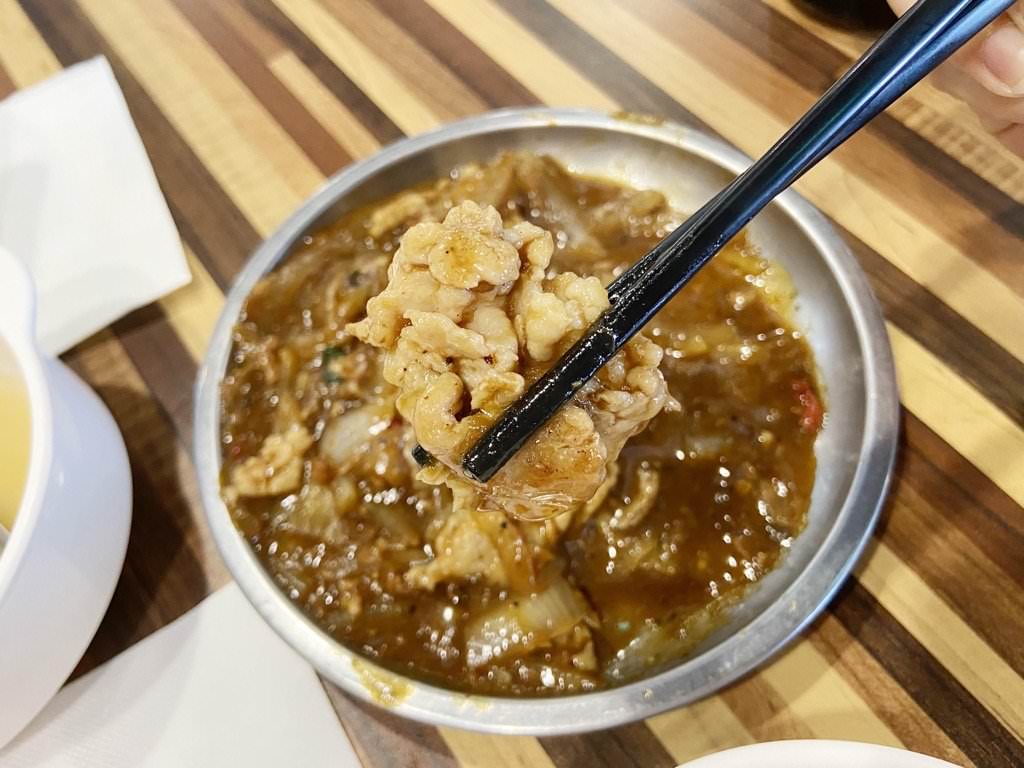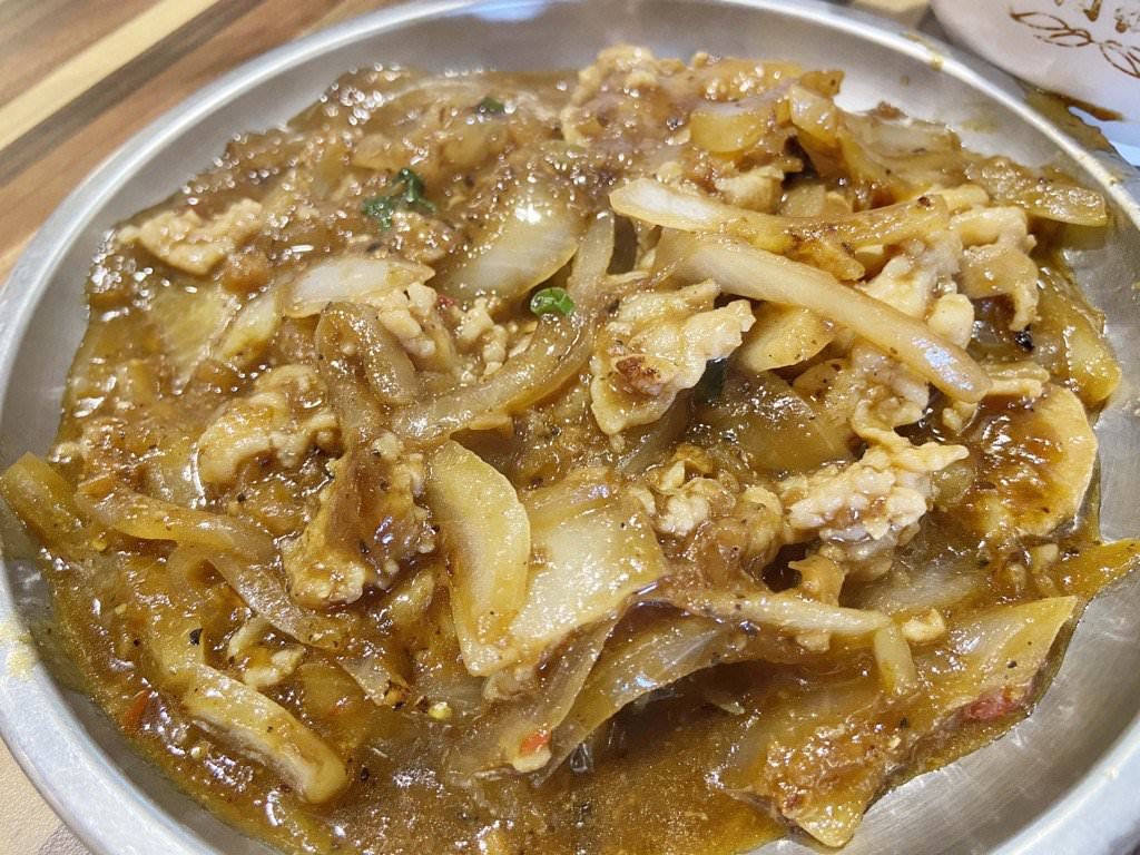 ▼ 鐵板炒豬肉片是醬香重、味道偏鹹很下飯的那種!